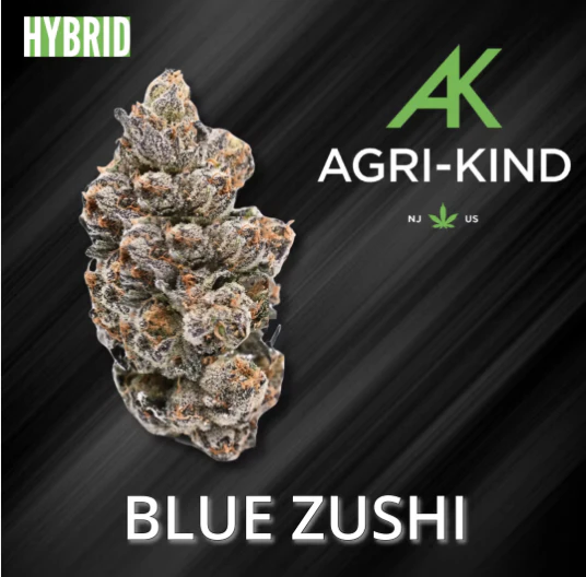 Blue Zushi is a slightly indica dominant hybrid strain created through crossing the delicious Zkittlez X Kush Mints strains. Known for its gorgeous appearance and pretty well balanced high, Blue Zushi is perfect for any indica lover. This bud has small and fluffy rounded forest green nugs with deep blue undertones, vivid orange hairs and a thick frosty coating of gorgeous tiny blue-tinted white crystal trichomes. As you pull apart each sparkling little nugget, aromas of spicy flowers and rich earthy pine are released, almost like walking through a forest after a rainstorm. The flavor is of sweet earth and spicy flowers with a mellow herbal tea-like taste that lingers on the tongue. The Blue Zushi high comes on with a slow sneaking creep, sneaking into you before launching you into a lifted and energized state. You'll feel a budding euphoria accompanied by a tingly buzzy body high that quickly makes your energy level u-turn into deep relaxation and ease.