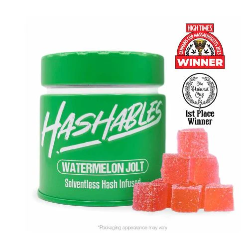 **Allergens: Contains Tree Nuts (MCT Oil) // Production Facility Contains: Tree Nuts ,Soy, Milk, and Wheat.** Hashables, a synergy of live hash rosin and scintillating flavor. Zap yourself into a new dimension with these full-spectrum hash-infused edibles! Formulated with solventless hash rosin and natural flavors, the effects of these edibles are potent and full-bodied. So leave it to the solventless extract experts and discover New England's own Hashables. WATERMELON JOLT: Corn Syrup, Sucrose, Water, Gelatin, Dextrose, Sorbitol, Acid Blend, Natural and Artificial flavoring , Solventless Cannabis Concentrate, Natural and Artificial coloring, Potassium Sorbate