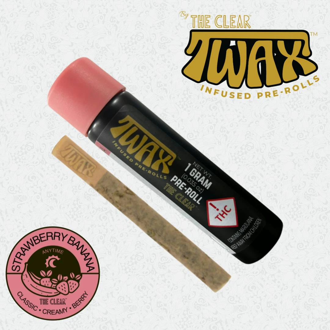 TWAX by The Clear™ is an infused pre-rolled joint for the experienced cannabis consumer. We grind full flower to the perfect consistency for the perfect burn. Then, our proprietary infusion process pumps up the potency for the perfect punch, every time. It provides the potency you need, with the smoothness and burnability you expect. Each pre-roll contains dye-free, unbleached papers, 1 gram of premium bud, and 30%-40% THC premium Strawberry Banana flavored distillate and naturally derived plant terpenes.
