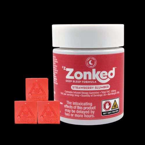 **Allergens: Contains Tree Nuts. Production Facility Contains: Tree Nuts, Soy, Milk, and Wheat.** Sleep like a log tonight with Zzzonked Edibles, the all-new super sedating collection of gummies. Made with a natural blend of melatonin and full-spectrum cannabinoids: CBN, CBD, and THC, it's the perfect recipe for a good night's sleep. Zzzonked can help you fall asleep faster, deeper and regulate your sleep cycle for a more replenishing rest. Eat one piece an hour before going to bed, and relax. Onset effects may take up to one hour to begin; effects may include calmness, drowsiness, and sedation. STRAWBERRY SLUMBER: Corn Syrup, Sucrose, Water, Gelatin, Dextrose, Sorbitol, Citric Acid, Strawberry Flavoring, Guava Flavoring, Cannabis Extract Oil, MCT Oil (Tree Nuts), Red Food Coloring, Potassium Sorbate, Melatonin, CBD Isolate, CBN Isolate